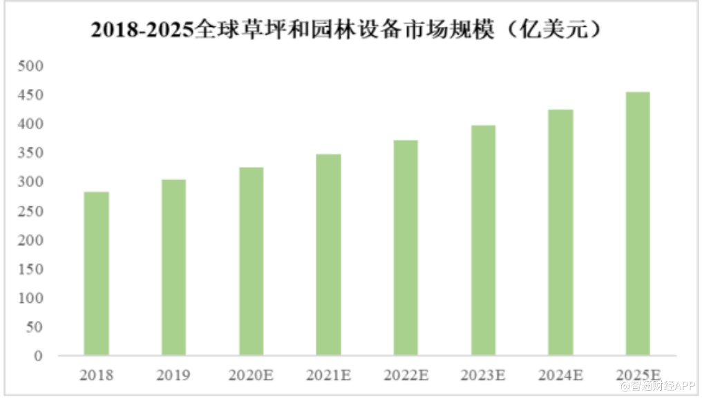根据GlobalMarketInsights的统计数据,2018年全球草坪和园林设备市场规模为283亿美元,预计至2025年将超过450亿美元,年均复合增长率接近7%,市场空间广阔。此外,GlobalMarketInsights预测,到2025年,随着园林机械产品的效率和技术提高,电动园林机械产品市场规模的年均复合增长率将达到8%。