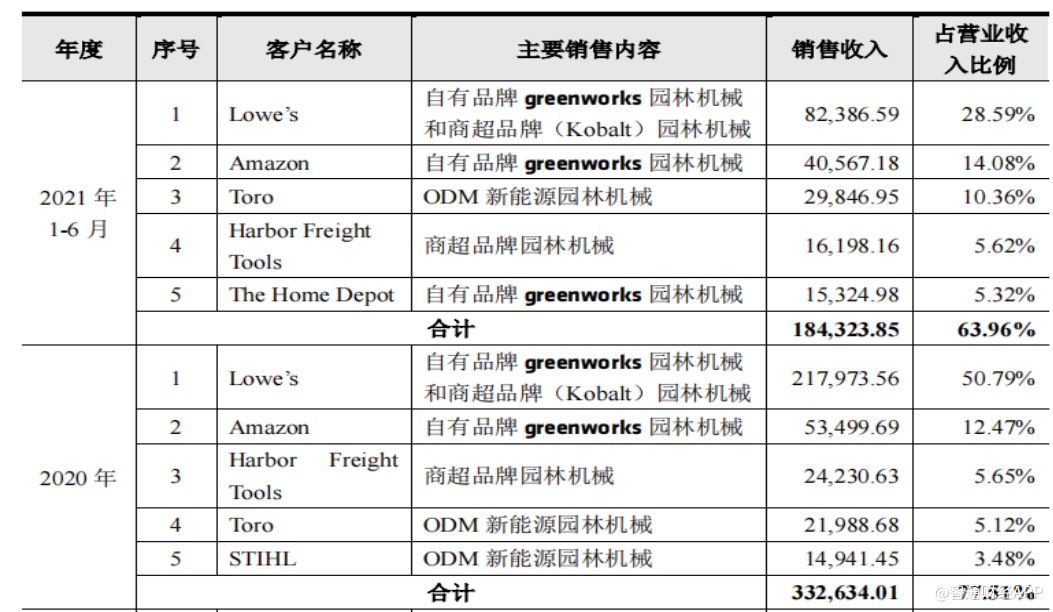 此外,格力博在2021年上半年利润大幅下滑,还与公司主要客户业务调整有关。过往业绩期间,公司的主要客户为Lowe’s、Amazon、The Home Depot、Walmart、Harbor Freight Tools、CTC、Bauhaus等大型商超、电商以及Toro、STIHL、B&S等行业内知名品牌商。报告期各期,公司前五大客户的销售占比分别为73.31%、74.04%、77.51%和63.96%,其中第一大客户Lowe’s的销售占比分别为48.08%、57.22%、50.79%和28.59%。