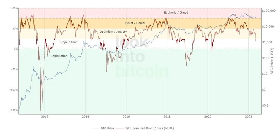 火币的结论基于这样一种论点:比特币的市场底部可以通过检查其未实现净损益(NUPL)的百分比来确定。 NUPL有五种不同的分类:狂喜/贪婪、信念/否认、乐观/焦虑、希望/恐惧,以及投降。根据比特币的 NUPL 图表,该资产目前处于“恐惧”分类中,因此可能尚未达到当前周期的最低价。