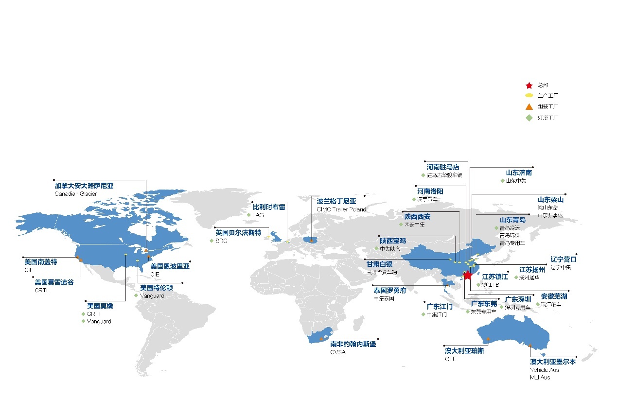 凭借“全球运营、地方智慧”的经营理念,并通过跨界设计、跨洋制造以及全球供应链的管理,中集车辆先后在北 美、欧洲、亚洲、非洲及大洋洲等区域建立了覆盖全球的生产基地及销售网络,形成了全球化营运的业务格局,并在全球范围内取得了令行业瞩目的成就。