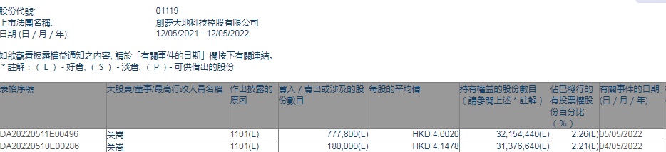 智通财经APP获悉,香港联交所最新资料显示,5月4-5日,执行董事兼首席技术官关嵩分别增持创梦天地(01119)77.78万股、18万股,每股作价分别为4.0020港元、4.1478港元,总金额约为385.94万港元。增持后最新持股数目约为3215.44股,最新持股比例为2.26%。