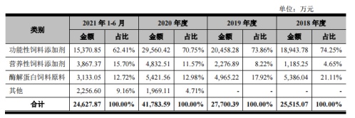 按产品分类,报告期内,美农生物饲料添加剂销售收入分别为2.01亿元、2.27亿元、3.44亿元和1.92亿元,占当期主营业务收入的比例分别为78.90%、82.08%、82.32%和78.12%,系公司销售收入的主要来源。饲料添加剂又可以分为功能性饲料添加剂和营养性饲料添加剂。营养性饲料添加剂系公司重要的收入增长点,销售规模增长较快,销售占比逐年上升。