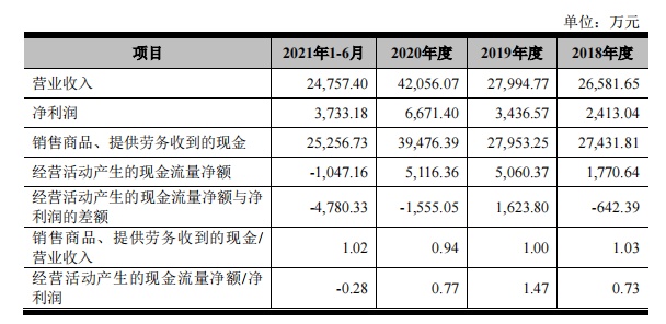 招股书显示,2020年至2021年上半年,美农生物的净利润分别为6671.4万元、3733.18万元,同比增幅达94.13%、51.31%,同一时期经营活动产生的现金流量净额却呈现出断崖式下降,即由2020年的5116.36万元,下降至2021年上半年的-1047.16万元。经营活动产生的现金流净额/净利润的比值从2018年的1.47下降至2021年上半年的-0.28,业绩含金量持续下滑。