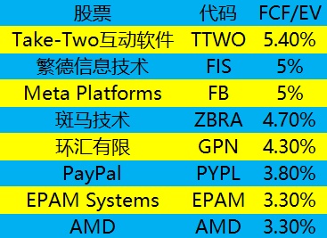 该团队剔除了高科技指数ETF和通信服务精选行业指数ETF,但不包括电信和媒体——它们从高点下跌了20%以上,自由现金流/市值(FCF/EV)高于3%的美国10年期国债收益率。该领域不包括评级为“跑输大盘”的股票。