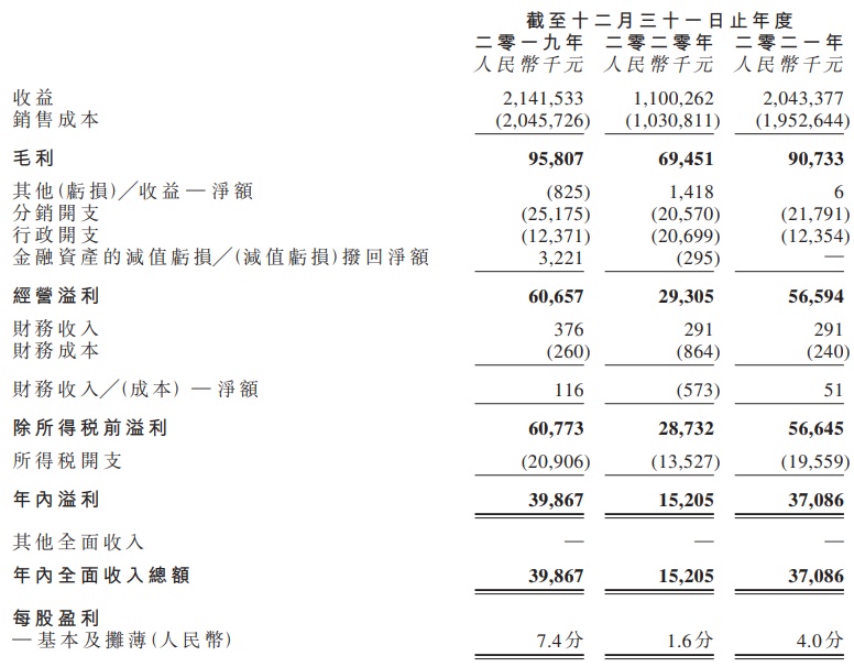 于2019年、2020年、2021年,金泰丰国际控股收益分别为约21.415亿元、11.003亿元、20.434亿元人民币;同期,毛利分别为9580.7万元、6945.1万元、9073.3万元人民币。