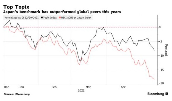 今年迄今为止,日本股市的表现优于全球同行,因此市场人气出现负面变化时,日本股市似乎很容易受到影响。东证指数(Topix)下跌8%,而MSCI除日本以外的AC世界指数(AC World Index)跌幅超过18%。