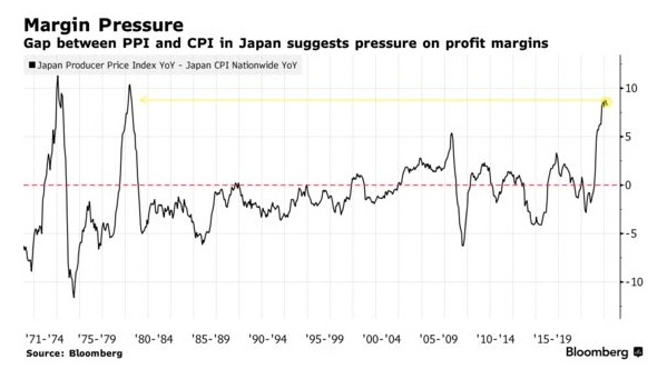 日本生产者价格指数(PPI)和消费者价格指数(CPI)之间的差距达到1980年以来的最高水平,表明传统上不愿提价的企业利润率面临更大压力。但分析师尚未下调他们的盈利预期。根据彭博的数据,目前的盈利预期处于至少17年来的最高水平。