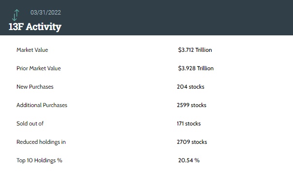 据统计,贝莱德Q1持仓总市值达3.712万亿美元,上一季度持仓总市值为3.928万亿美元,环比下跌5.50%。贝莱德在一季度的持仓组合中新增了204只个股,增持了2599只个股;同时减持了2709只个股,清仓了171 只个股。其中,前十大持仓标的占总市值的 20.54%。