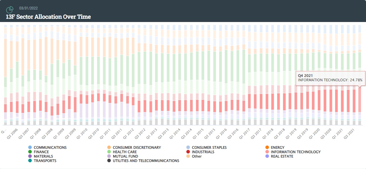 从持仓偏好来看,贝莱德青睐科技股,占总持仓的比例为24.78%。紧接着是金融股和医疗保健股,分别占总持仓的15.69%和12.86%。
