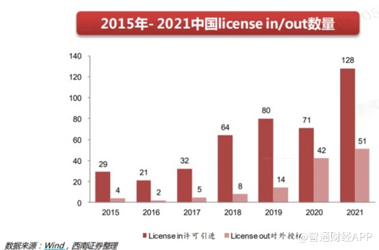 再鼎医药的成功,也吸引了众多医药企业模仿,近年来,国内药企License in交易数量接连创出新高。据西部证券统计,2021年,国内公司License in项目共128项。