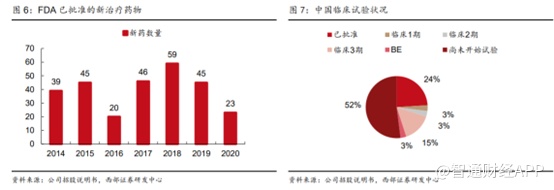 此外,据Frost&Sullivan 数据显示,从 2014 年至2020年6月 FDA 批准的277种新药中,合计142种(52%)尚未在国内开展临床试验,由于临床项目及监管批准的延迟,中国与其他地区药物治疗标准可能存在差异,这为“引进来”发达国家已证明有临床价值创新候选药提供巨大机遇。