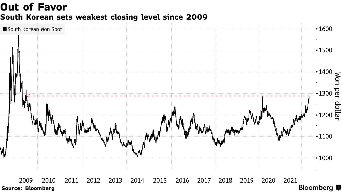 智通财经APP观察到,随着出口主导型经济体受到供应链混乱和能源价格高企带来的负面影响,韩元汇率周四收于10多年来的最低水平,并且技术指标暗示下跌趋势或将持续。