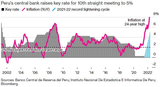 智通财经APP获悉,为了遏制飙升的通货膨胀,秘鲁央行将基准利率上调50个基点至5%,达13年来最高水平,符合市场预期。此外,该国上个月总体通胀率上升至8%,为1990年末以来的最高水平,不过仍低于哥伦比亚、智利和巴西的通胀率。据了解,秘鲁央行的通胀目标为2%,上下浮动一个百分点。