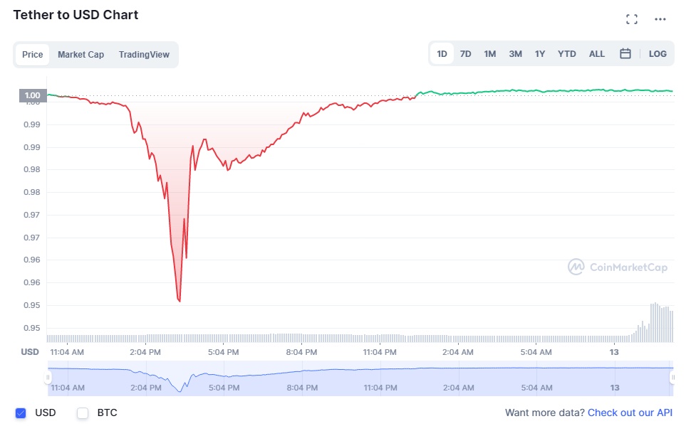 市值最大的稳定币Tether( USDT )也从一场小型崩盘中恢复过来,其他代币也有所回升。周四,Tether在欧洲交易时段一度跌至95.11美分,远低于1美元的挂钩汇率,不过随后价格回升至正常水平。