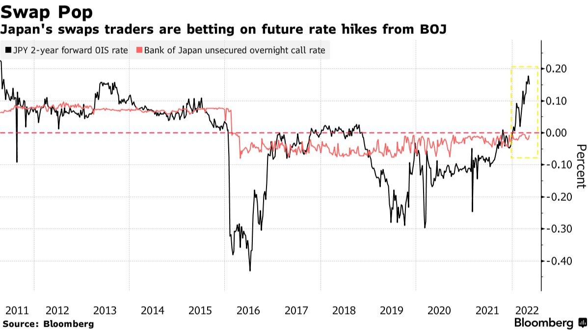智通财经APP获悉,尽管日本央行官员坚称将坚持超宽松政策,东京货币市场交易员仍在加大对未来加息的押注。如下图所示,衡量隔夜拆借利率在两年内将处于何种程度的指标(两年期隔夜指数掉期)已经进一步远离当前利率,并于本周触及2011年以来的最高水平。
