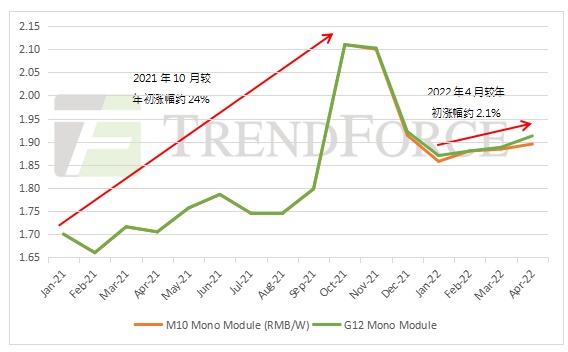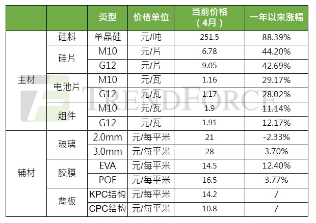 组件价格也呈现上涨趋势,但考虑到项目商的接受度,价格上涨幅度较小,M10及G12组件4月均价已至1.9元/W、1.91元/W,同比涨幅仅为11.1%、12.2%,远不及上游涨价幅度,组件严重承压。