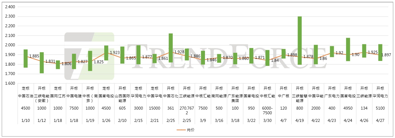 截至4月底,2022年各大央国企已公布近70GW光伏组件招标规模,已超2021年集采的总规模,尽管数量如此庞大,单价有所上涨,但组件企业大多面临着增收难增利现状。据集邦咨询数据统计2022年1-4月组件投标价均价集中在1.86-1.90元/W左右,低价资源逐步减少,最高投标价格达到2.076元/W,突破“2元”大关,整体来看,对比上游各环节,组件投标价格上涨幅度微乎其微。