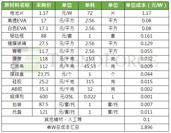 表:组件成本拆解(以545W单面单玻为例,尺寸:2256*1133*35MM)
