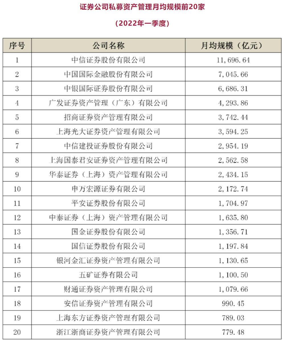 智通财经APP获悉,券商私募资产管理规模排名出炉!5月12日晚间,中国基金业协会公布2022年一季度各项资管业务月均规模数据。