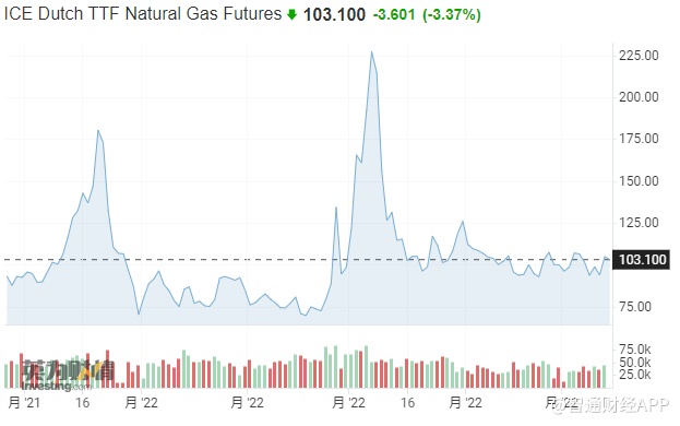 智通财经APP获悉,因周五俄罗斯输往欧洲的天然气流量保持稳定,欧洲天然气价格回落。此前,由于途经乌克兰的一条关键输气路线中断,以及俄罗斯削减对德国的供应,欧洲天然气价格周四一度上涨14%。截至发稿,欧洲基准天然气期货价格跌3.37%,至每兆瓦时103.10欧元。