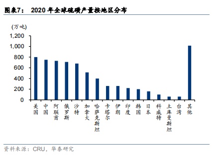 供给端来看,根据CRU数据,2020年全球硫磺产量约6900万吨,其中美国、中国、阿联酋、俄罗斯、沙特为前五大生产国,同时阿联酋、俄罗斯、沙特、加拿大、哈萨克斯坦、卡塔尔、伊朗亦为全球硫磺主要出口国,其产量分别占全球的11%、10%、10%、7%、6%、4%、4%。