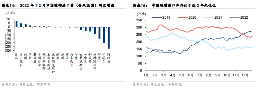 分来源国统计,中国来自阿联酋、卡塔尔、阿曼、沙特、科威特及加拿大的硫磺显著下降,仅有日本、韩国、委内瑞拉、伊朗的进口量显著增长,其中委内瑞拉硫磺运输距离长,质量较差,国内大量进口委内瑞拉硫磺亦侧面印证国际硫磺供应的紧张。同时,中东硫磺进口的下降,这导致我国硫磺港口库存持续紧张。