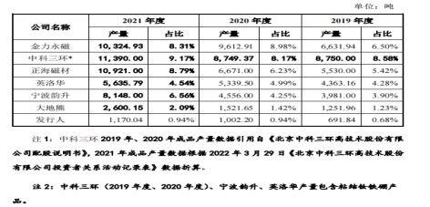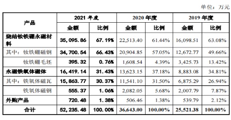 据中科磁业招股书,公司主要从事永磁材料的研发、生产和销售,公司是目前国内重要的永磁材料生产商之一。主要生产第三代永磁材料烧结钕铁硼永磁材料和第二代永磁材料永磁铁氧体磁体两类产品。烧结钕铁硼永磁材料具有磁性强、质量轻、体积小、能效高等特点,是目前工业化生产中综合性能最优的永磁材料,是精密电声器件、稀土永磁申机等当代制造业重要部件的关键电子材料。2021年,公司烧结钕铁硼永磁材料销售额达到3.51亿元(人民币,下同),占营收比重达到67.19%。