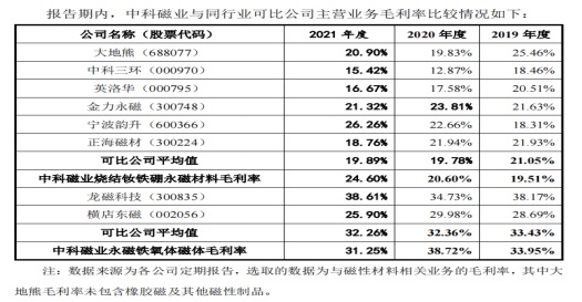 横向对比来看,2021年中科磁业烧结钕铁硼永磁材料的销售毛利率达到24.6%,高于可比公司平均值19.89%的水平,公司永磁铁氧体磁体的销售毛利率为31.26%接近可比公司32.26%的平均水平。