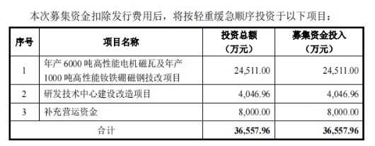 为突破产能瓶颈,中科磁业拟上市募集3.66亿元资金,其中2.45亿元用于年产6000吨高性能电机磁瓦及年产1000吨高性能钕铁硼磁钢技改项目。