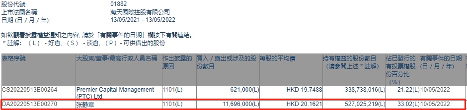 智通财经APP获悉,香港联交所最新资料显示,5月10日,董事长张静章增持海天国际(01882)1169.6万股,每股作价20.1621港元,总金额约为2.36亿港元。增持后最新持股数目约为5.27亿股,最新持股比例为33.02%。