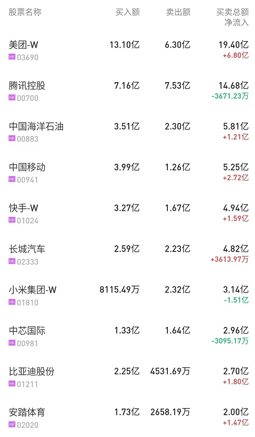 北水净买入最多的个股是美团-W(03690)、腾讯(00700)、中国移动(00941)。北水净卖出最多的个股是中芯国际(00981)。