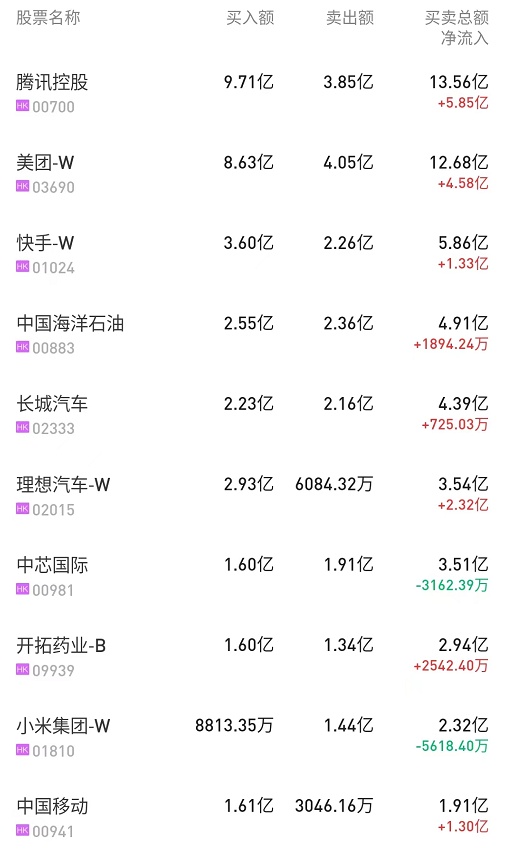 此外,安踏体育(02020)、中海油(00883)分别获净买入1.46亿、1.4亿港元。而中芯国际(00981)遭净卖出6257万港元。