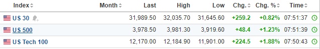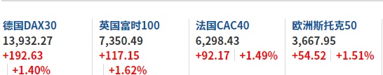 2.截至发稿,德国DAX指数涨1.40%,英国富时100指数涨1.62%,法国CAC40指数涨1.49%,欧洲斯托克50指数涨1.51%。