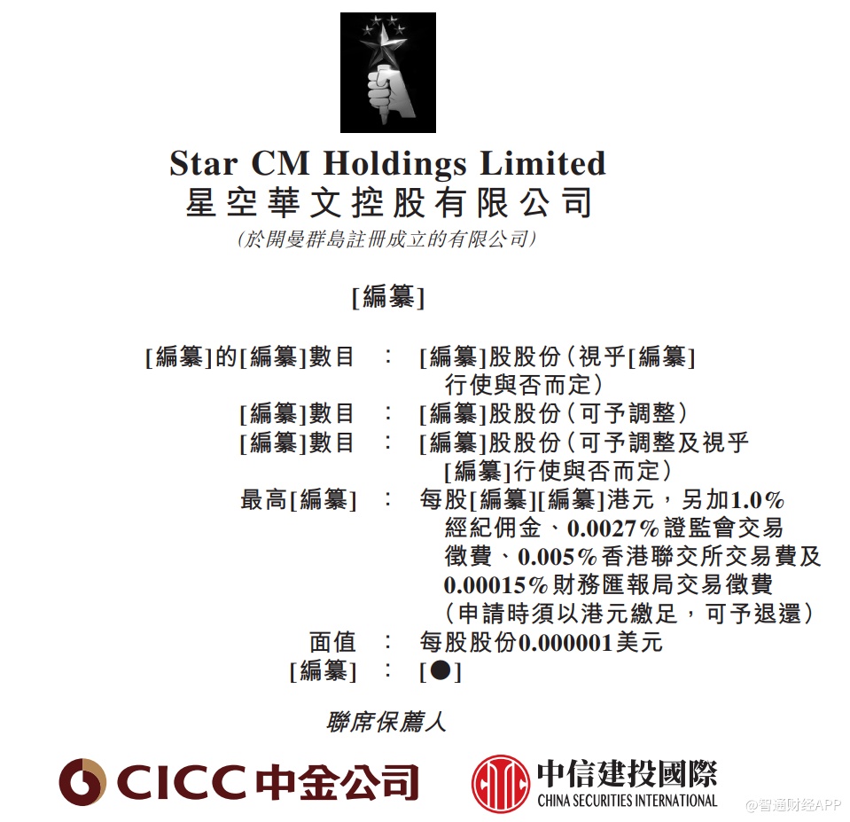 智通财经APP获悉,据港交所5月13日披露,星空华文控股有限公司向港交所主板提交上市申请,中金公司及中信建投国际为联席保荐人。星空华文为灿星文化在2021年8月重组后的主体公司,曾于2021年11月递表港交所。