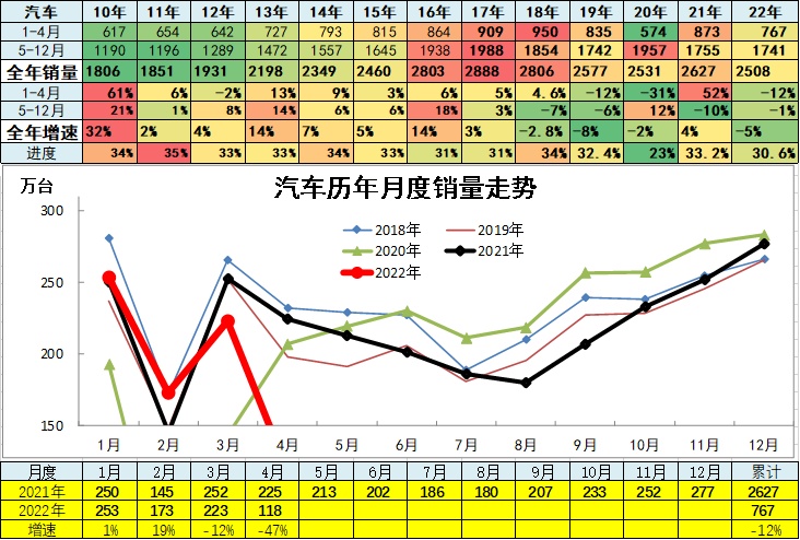 2022年4月累计汽车总计销量767.34万台,较去年同期累计增速-12.1%;4月汽车总计销量118.09万台,较去年同期同比增长-47%,环比上月增长-47%。