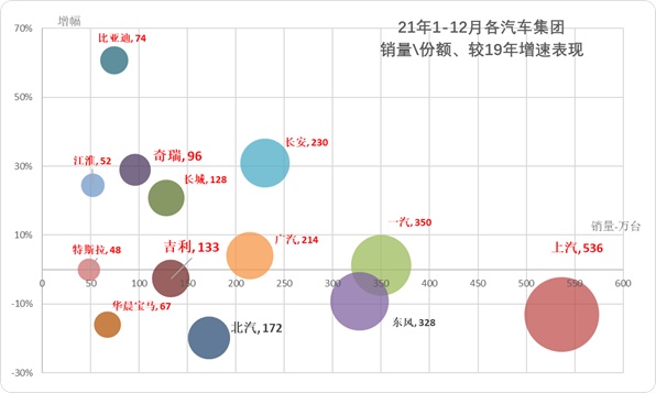2021年车市走势不强,各集团因为卡车与乘用车优势板块的差异化市场需求而走势分化。