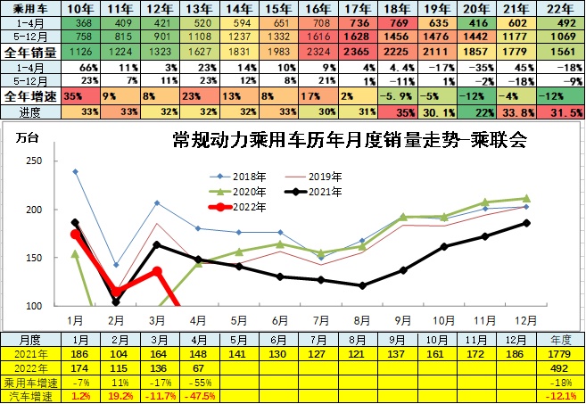 2022年4月累计狭义乘用车销量492万台,较去年同期累计增速-12%;4月传统狭义乘用车销量67万台,较去年同期同比下降55%,环比上月下降51%。