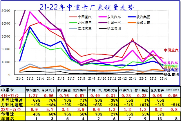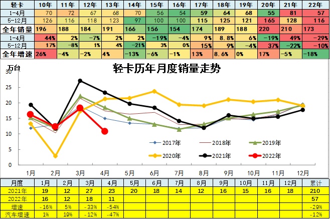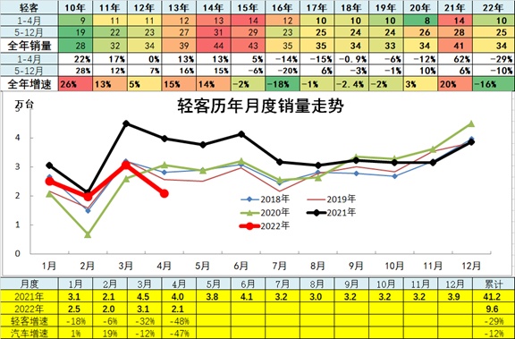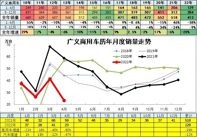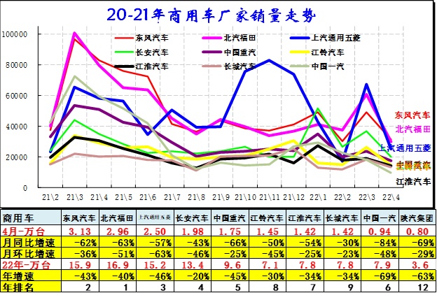 商用车市场总体走势较低,2022年4月份同比下降60%,呈现历年少有的超低增速特征。