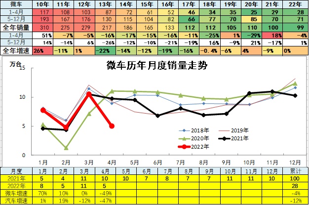 2022年4月累计微型车销量28.07万台,较去年同期累计增速-3.9%;4月微型车销量5万台,较去年同期同比增长-48.8%,环比上月增长-52.5%。