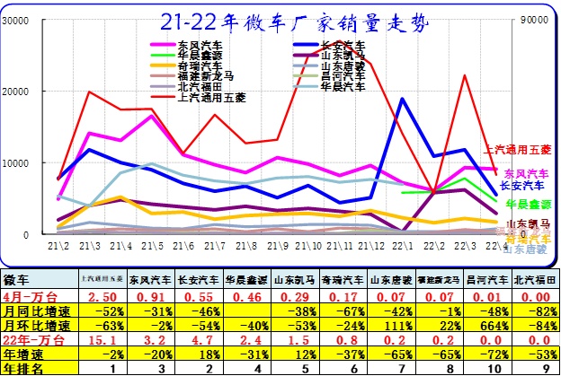 2022年的的五菱走势相对很强,长安汽车的微车冲刺,2022年4月其它厂家分化。华晨鑫源走势改善,微车其它企业走势压力仍较大。