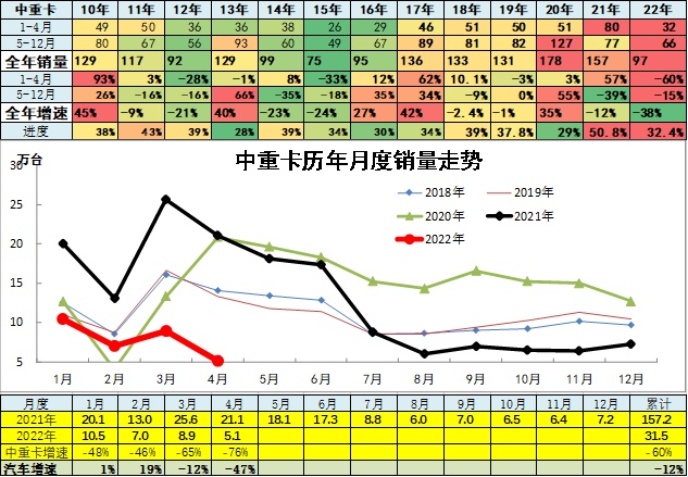 2019年全年累计中重卡销量131.36万台,累计增速-0.9%;2020年累中重卡销量177.8万台,累计增速35%;2021年累中重卡销量157.2万台,累计增速-12%;2022年4月累计中重卡销量31.53万台,较去年同期累计增速-60%;4月销量5.14万台,较去年同期同比增长-75.7%,环比上月增长-42.3%。