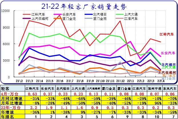 2022年4月累计轻客销量9.6万台,较去年同期累计增速-29%;4月销量2.07万台,较去年同期同比增长-48%,环比上月增长-32.5%。轻客企业的走势相对平稳,近期波动不大。由于轻客新能源的突破速度较慢,专用车的走势也不是很强,因此轻客的市场压力仍大。