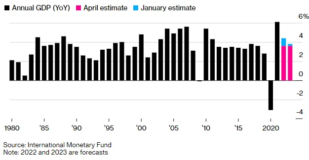 国际货币基金组织在4月份对2022年和2023年的增长率的预测低于1月份时的预测