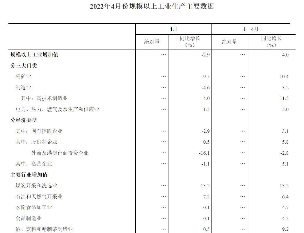 智通财经APP获悉,5月16日,国家统计局发布4月规模以上工业增加值数据显示,1—4月份,规模以上工业增加值同比实际增长4.0%(以下增加值增速均为扣除价格因素的实际增长率)。4月份,规模以上工业增加值同比下降2.9%。从环比看,4月份,规模以上工业增加值比上月下降7.08%。