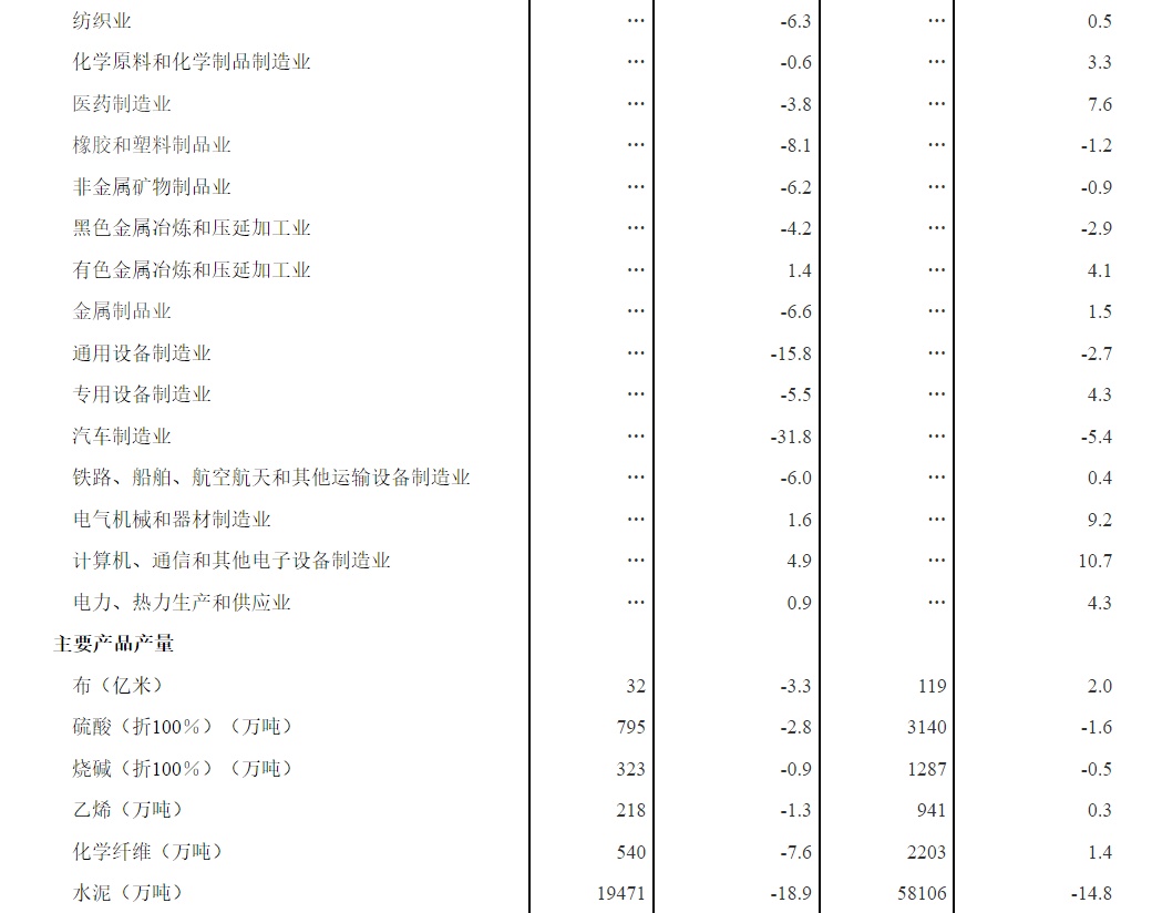分行业看,4月份,41个大类行业中有18个行业增加值保持同比增长。其中,煤炭开采和洗选业增长13.2%,石油和天然气开采业增长7.2%,农副食品加工业下降0.1%,酒、饮料和精制茶制造业增长0.5%,纺织业下降6.3%,化学原料和化学制品制造业下降0.6%,非金属矿物制品业下降6.2%,黑色金属冶炼和压延加工业下降4.2%,有色金属冶炼和压延加工业增长1.4%,通用设备制造业下降15.8%,专用设备制造业下降5.5%,汽车制造业下降31.8%,铁路、船舶、航空航天和其他运输设备制造业下降6.0%,电气机械和器材制造业增长1.6%,计算机、通信和其他电子设备制造业增长4.9%,电力、热力生产和供应业增长0.9%。