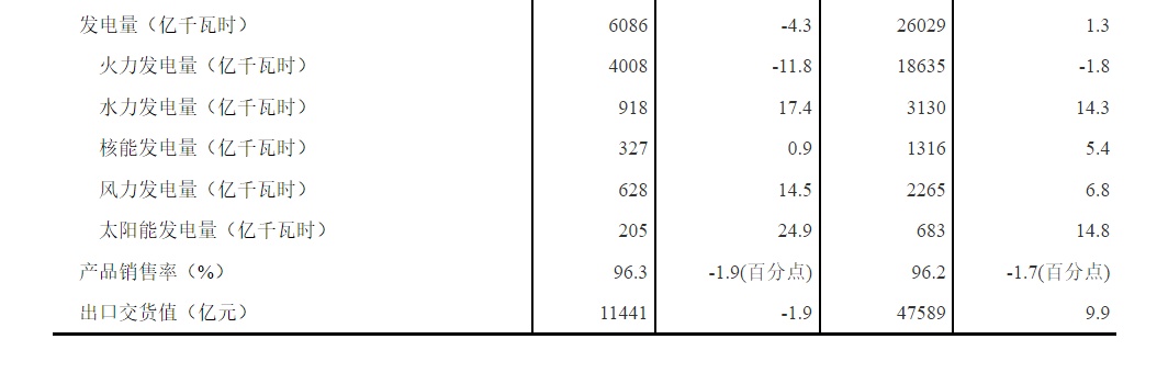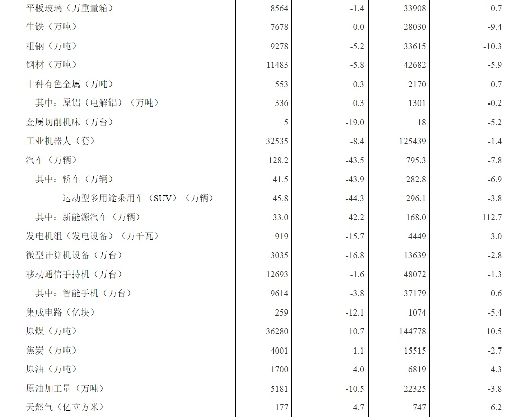分产品看,4月份,617种产品中有169种产品产量同比增长。钢材11483万吨,同比下降5.8%;水泥19471万吨,下降18.9%;十种有色金属553万吨,增长0.3%;乙烯218万吨,下降1.3%;汽车128.2万辆,下降43.5%,其中,新能源汽车33.0万辆,增长42.2%;发电量6086亿千瓦时,下降4.3%;原油加工量5181万吨,下降10.5%。