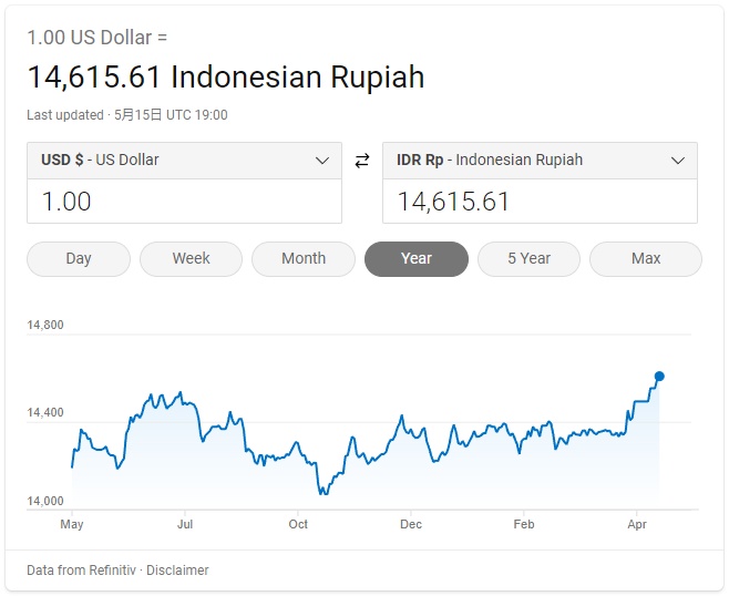 渣打银行东盟和南亚外汇研究主管Divya Devesh表示,投资者正关注进一步的出口限制和对美元的需求上升。他预计到6月底,印尼盾兑美元汇率将从上周五的1美元兑14,613印尼盾贬值至1美元兑14,800印尼盾。截至发稿,印尼盾兑美元汇率为1美元兑14,615.61印尼盾。