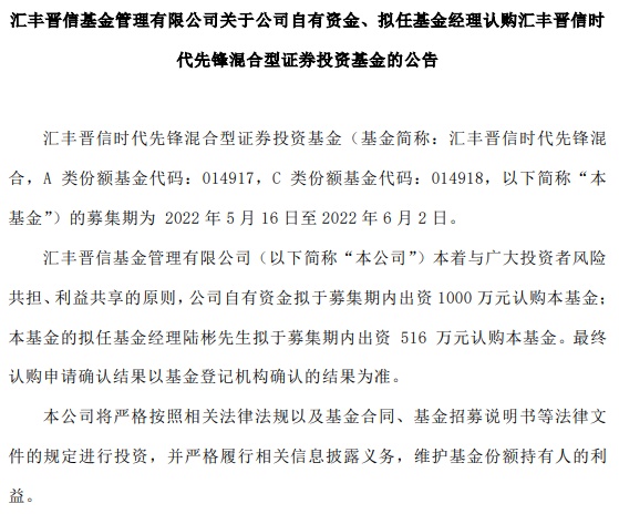 对此,为增强投资者的信心,基金公司及基金经理纷纷出手自购。5月16日,汇丰晋信基金发布公告称,本着与广大投资者风险共担、利益共享的原则,公司自有资金拟于募集期行情内出资1000万元认购汇丰晋信时代先锋混合型证券投资基金;基金的拟任基金经理陆彬先生拟于募集期内出资516万元认购该基金。