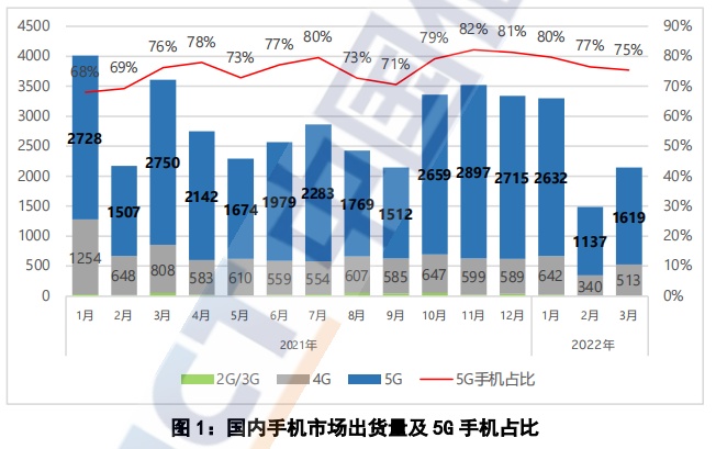 2022年3月,国内市场手机出货量2146.0万部,同比下降40.5%,其中,5G手机1618.5万部,同比下降41.1%,占同期手机出货量的75.4%。