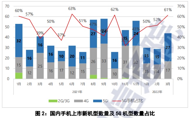 2022年3月,国内手机上市新机型44款,同比增长7.3%,其中5G手机27款,同比增长68.8%,占同期手机上市新机型数量的61.4%。